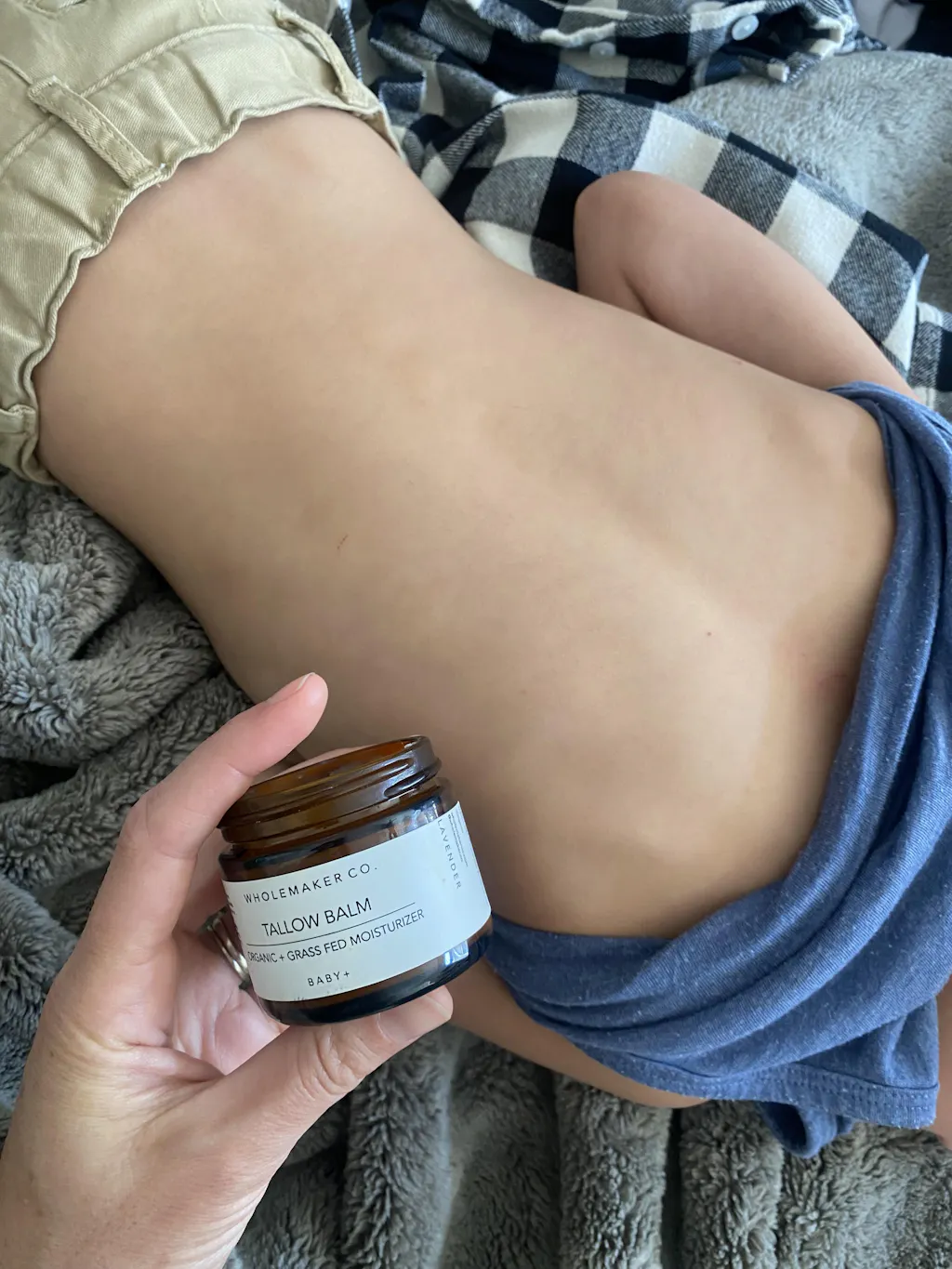 The Baby+ Tallow Balm helps clear up diaper rash, eczema, dry skin, cradle cap, PLUS it’s nourishing for mama’s growing belly + for adults with sensitive skin too.
