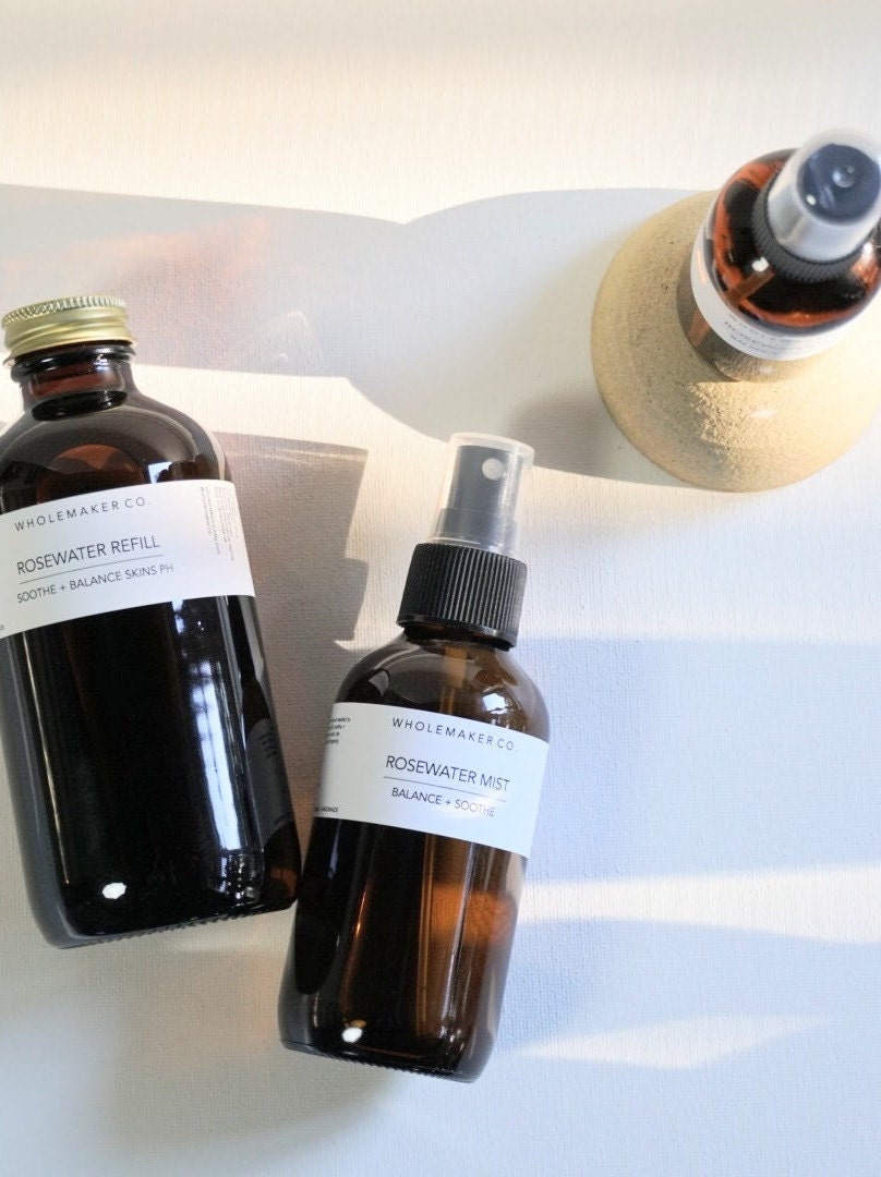 Hydrosols are the perfect addition to any + all skincare routines. Made from distilling fresh flowers, leaves, fruits + other plant materials, our Rosewater Mist (distilled rose petals) helps soothe sensitive + irritated skin, balances the skins pH levels (meaning the skins acidity + alkalinity levels, which overtime can help steady the skins oil production + minimize breakouts), it's hydrating, calms redness + benefits maturing skin.