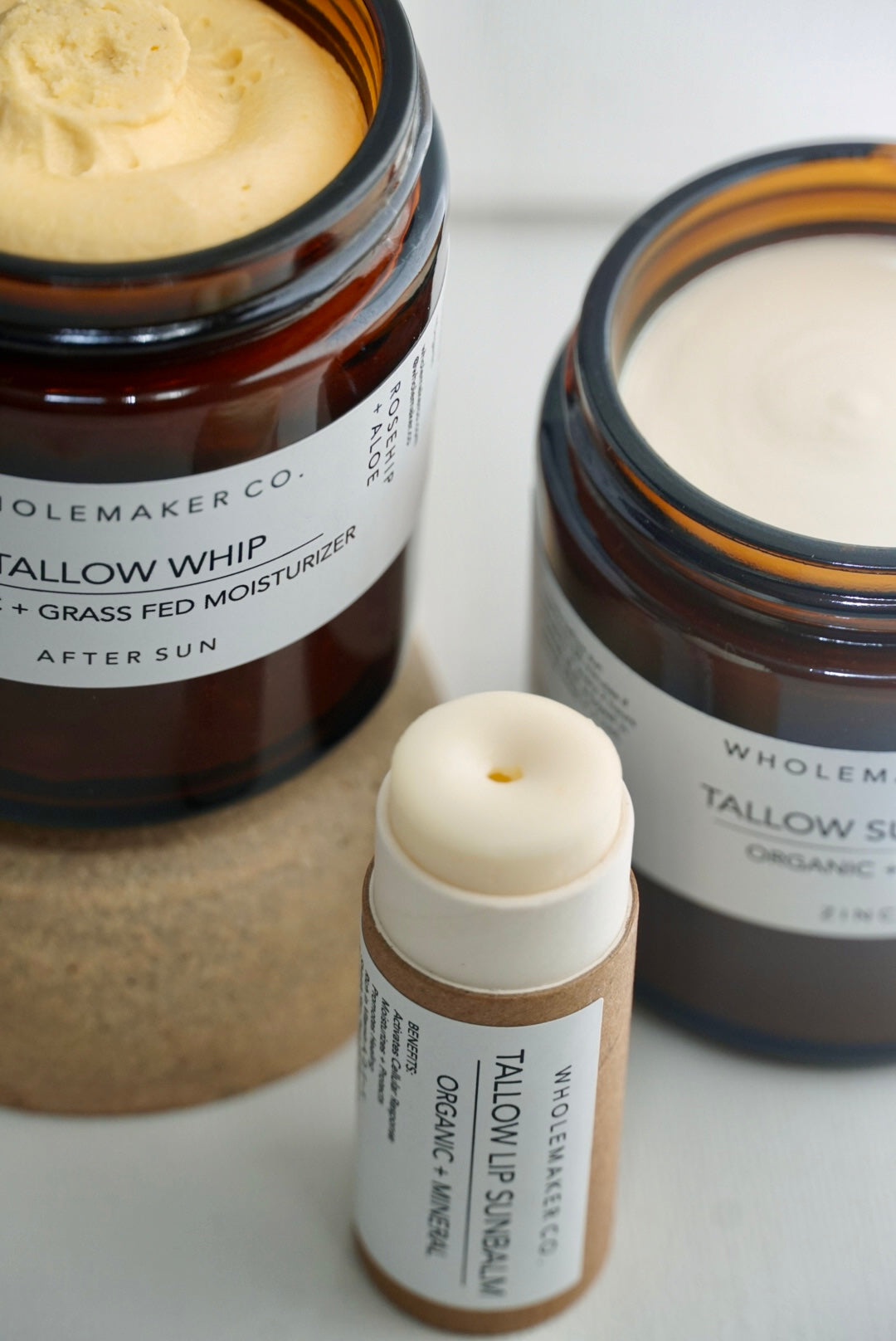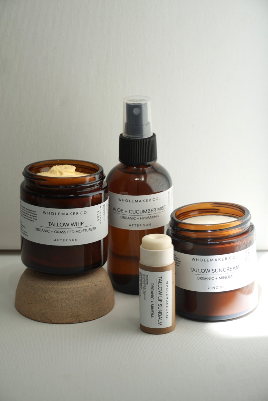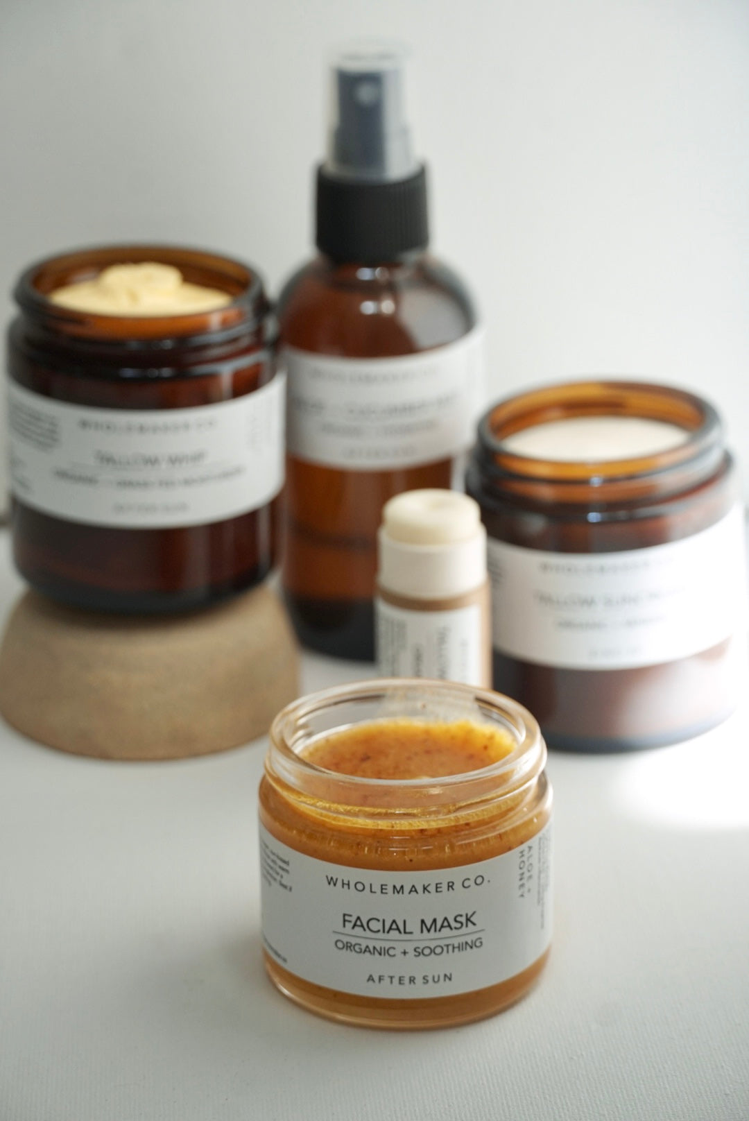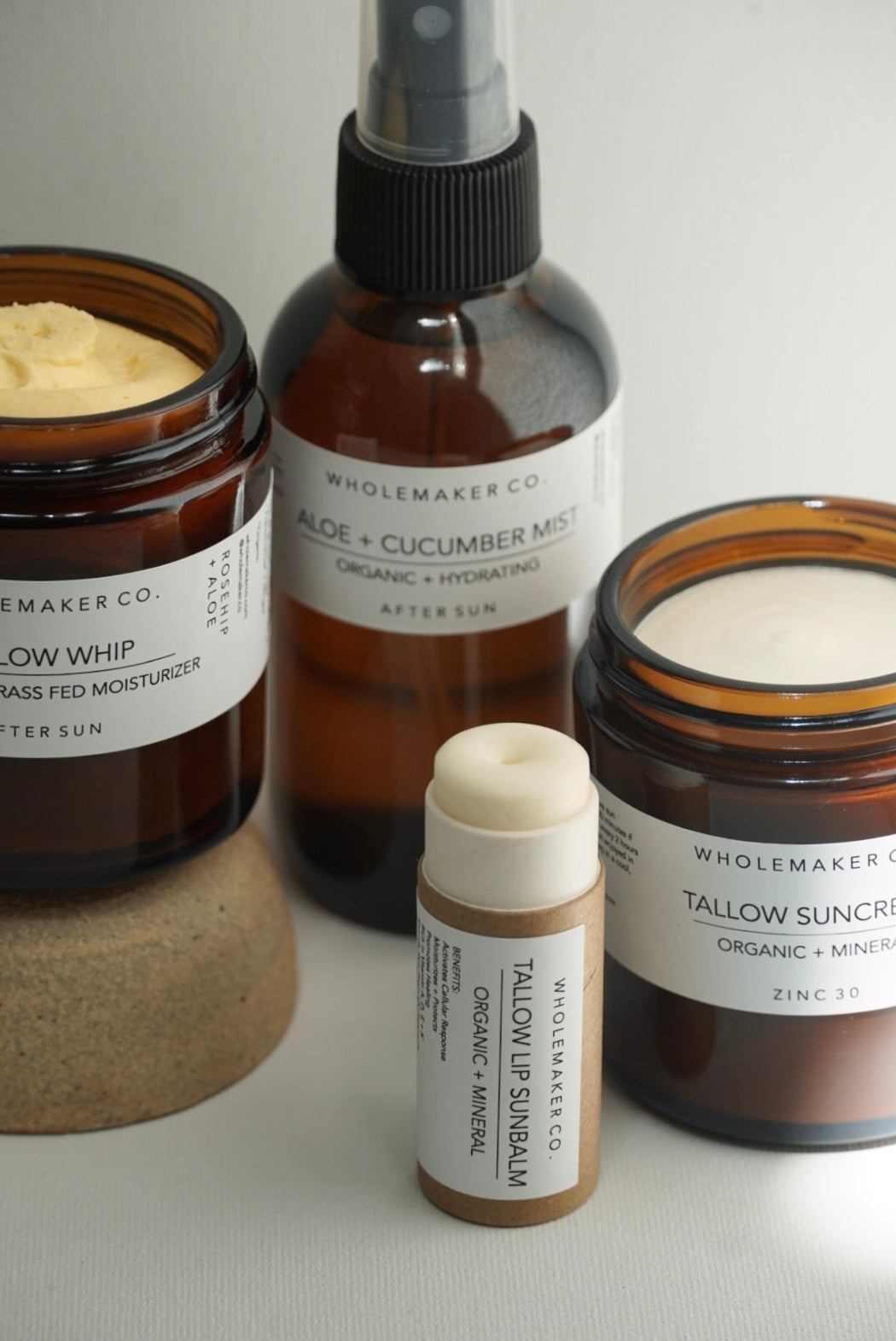 This set includes the Tallow Suncream, Tallow Lip Sunbalm, After Sun Tallow Whip, and After Sun Mist. Option to add on the After Sun Facial Mask at checkout.