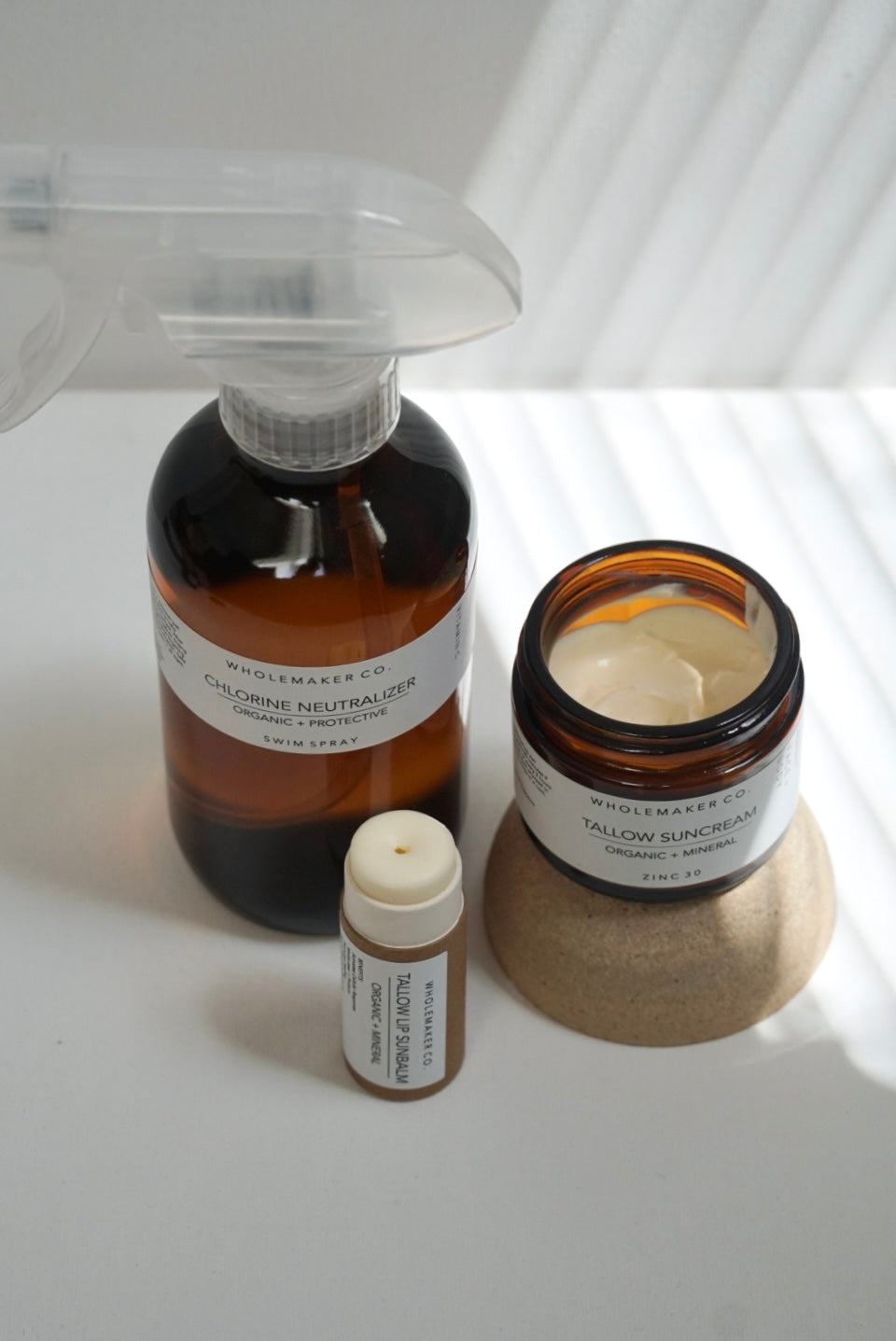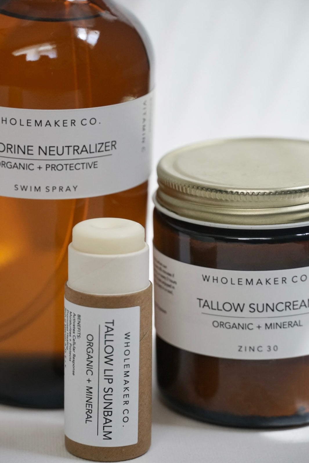 Find our gentle, mineral-based sun protecting formulas here in the Tallow Suncream 30 and Tallow Lip Sunbalm 4. With ingredients like organic grass-fed tallow, carrot seed oil, and non-nano zinc oxide—it’s safe for the whole family. The highlight of this set is our Chlorine Neutralizer Swim Spray to use before and after chlorine exposure, protecting the skin and neutralizes chlorine on contact!